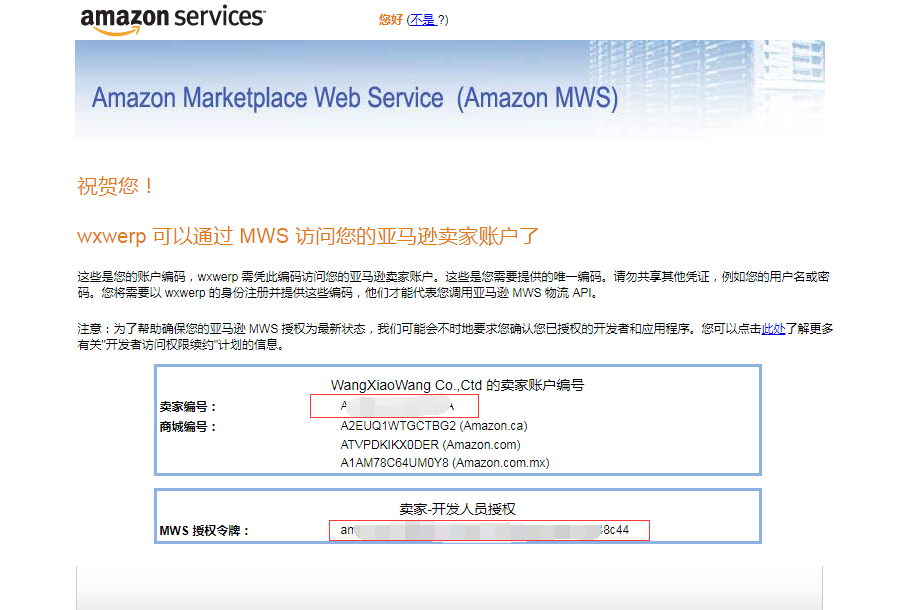 6、将下图中的“买家编号”和 “MWS 授权令牌”复制出来 填入旺销王系统中的授权页面