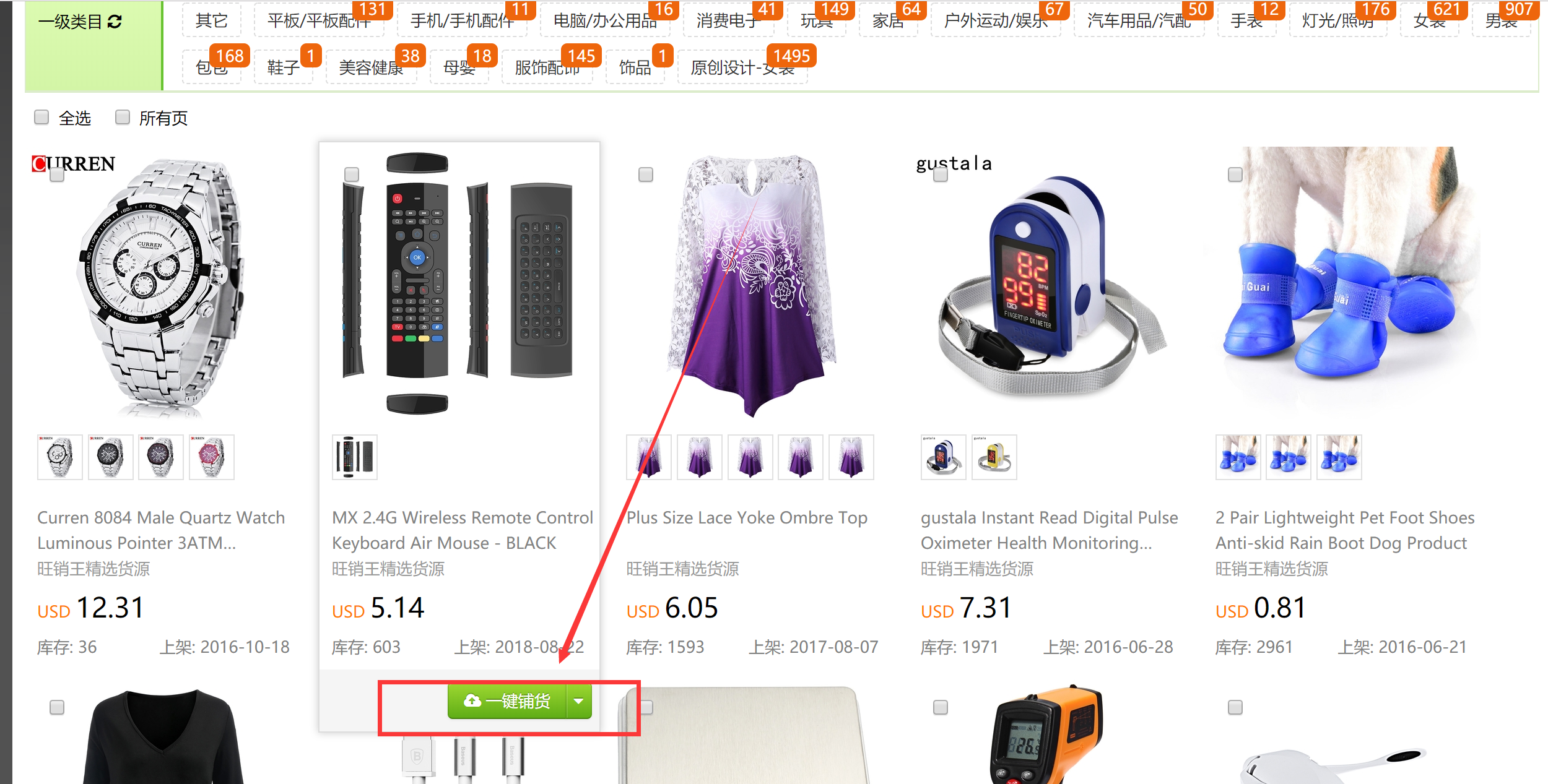 支持一键铺货到速卖通、shopee、wish等跨境电商平台。不用囤货直接铺货,出单后再付款。真正做到零成本,零库存。