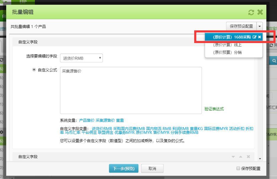 通常我们的售价应该是基于产品的重量、成本价,以及物流等信息进行计算的,我们在此之前可以利用Excel文档的方式将它先进行定义,然后将公式导入到软件上面,我们只需要保存预配置在下一次进行加载的时候直接导出预配置,就可以快速的进行批量编辑,价格在此我简单的给大家看一下我的价格定义的构成究竟是怎么样的